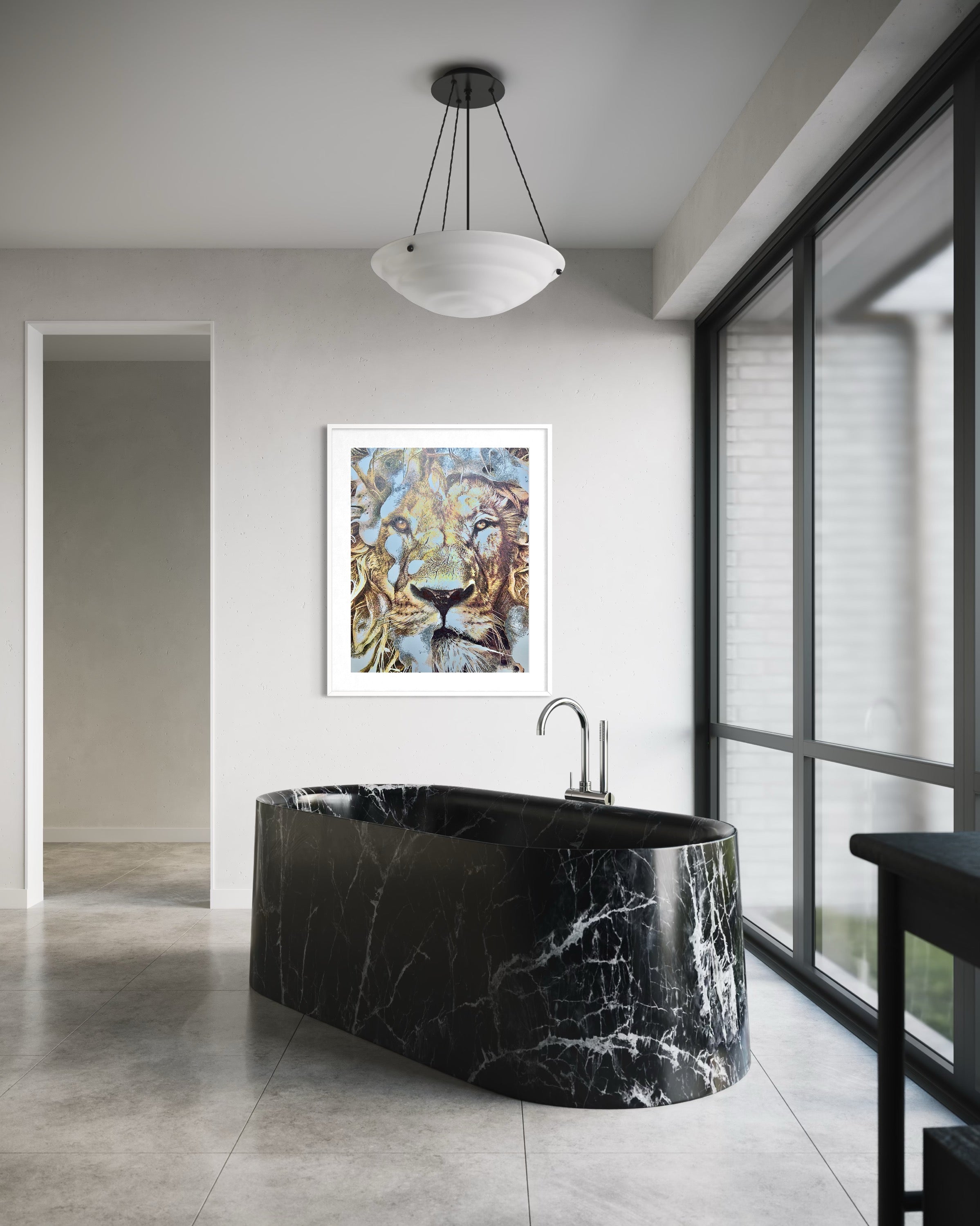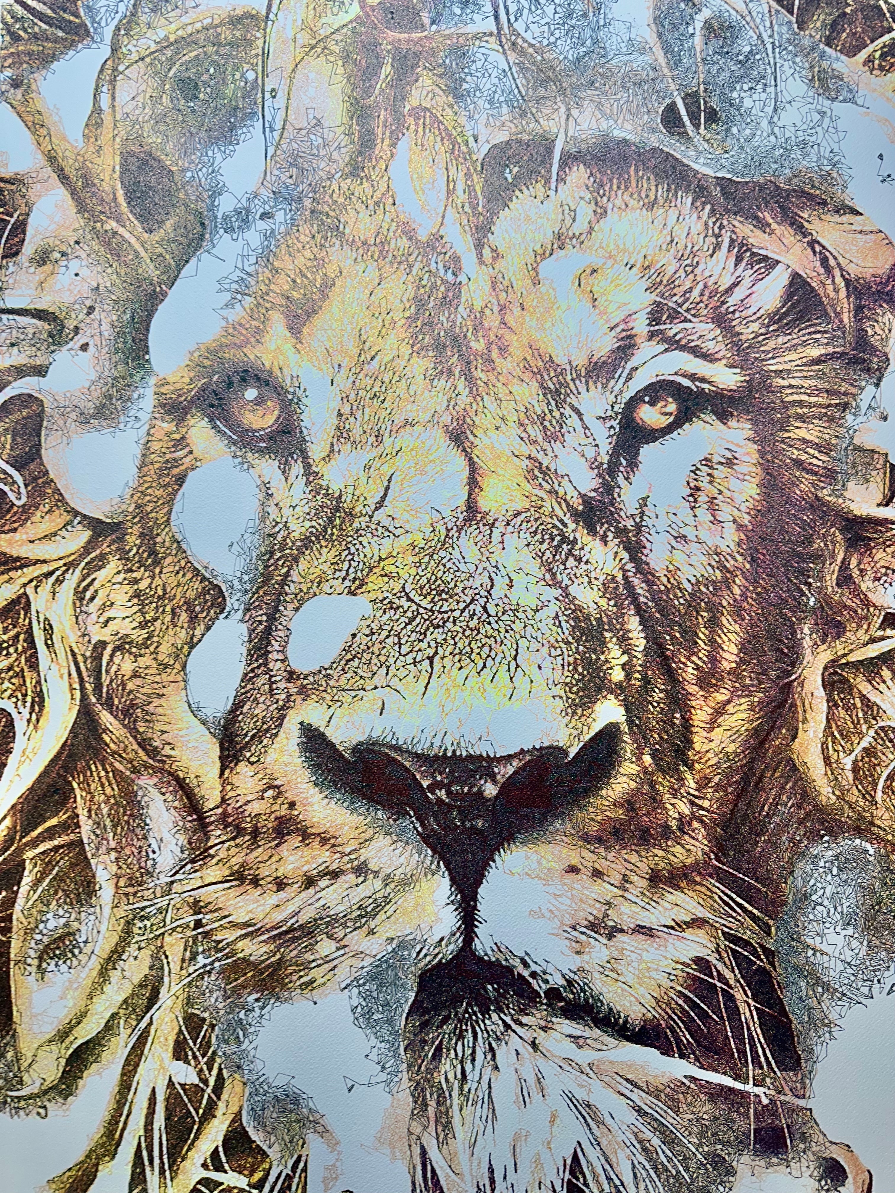 In Gaze, Lingua captures a moment of primal stillness—where raw power meets sacred awareness. This close-up lion portrait is a study in presence. His eyes lock with yours, challenging and calm, as if peering into the soul. His mane, layered with surreal textures and organic flourishes, appears to dissolve into branches and roots—blurring the line between predator and planet.