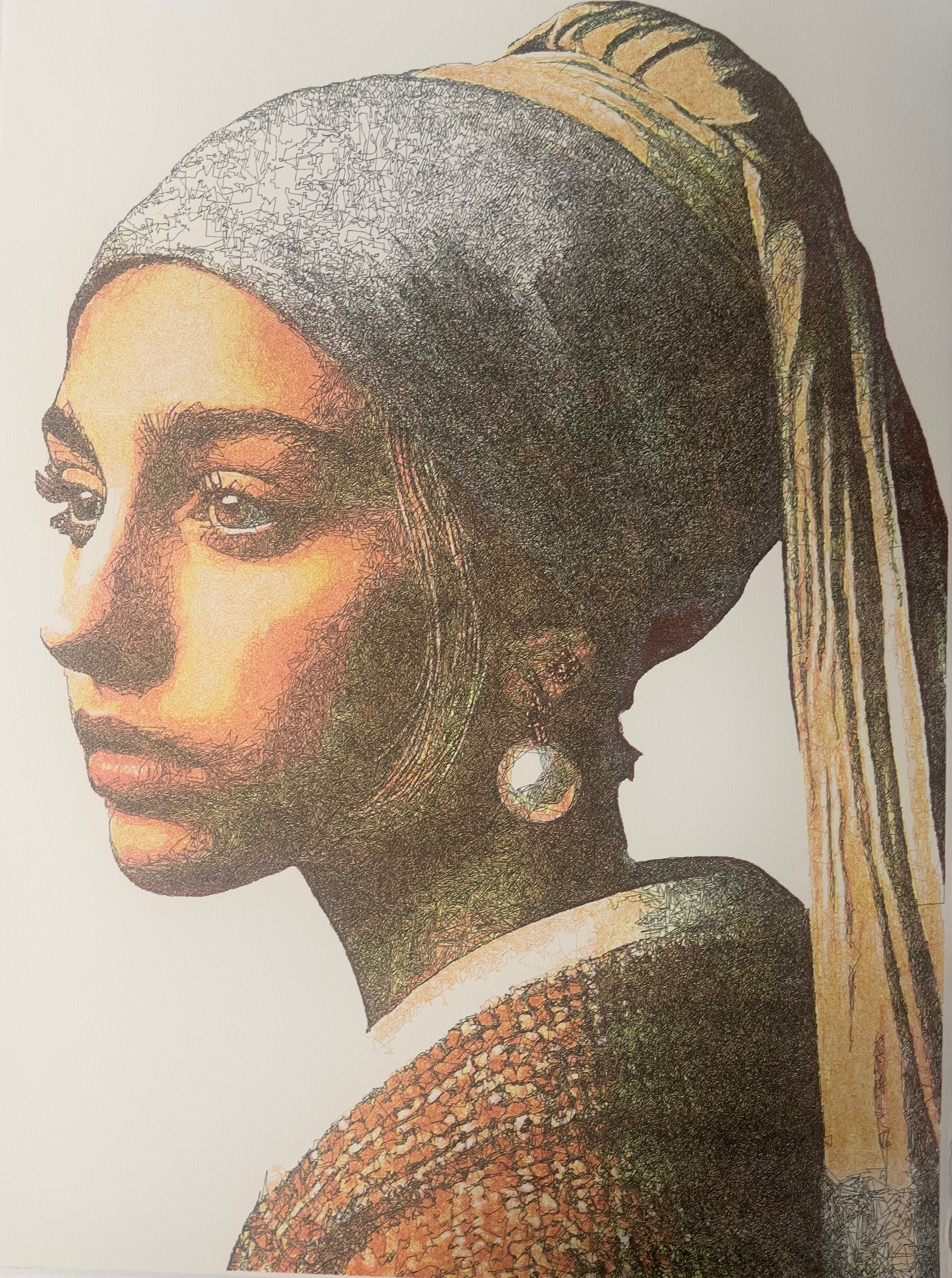 In The Modern Pearl, Lingua reinterprets one of the most iconic portraits in art history—Girl with a Pearl Earring—through a contemporary lens. Rendered in Lingua’s signature gel ink technique, this piece radiates with depth, sensitivity, and precision. The subject’s gaze is timeless, yet her expression and styling evoke a modern muse—bridging centuries in a single glance.